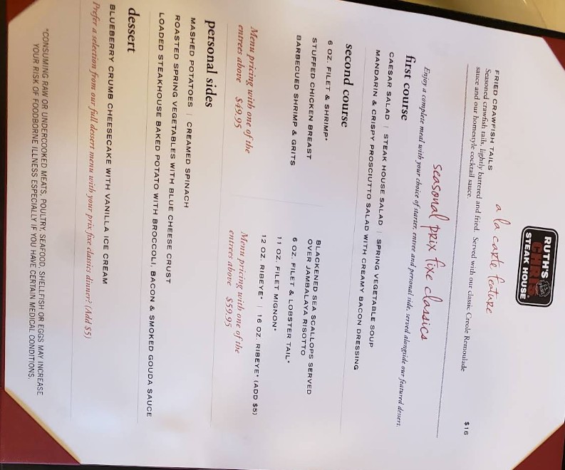 Food was good here, they just made a very bad service blunder. The place says it has a dress code, which isn’t overly important to me…. But I come here on a date, sit in a booth by the window and even though the place is at 20% capacity, they sit a table full of teenagers in gym shorts and flip flops right next to me. I guess this is part of the Atlanta charm for most people but I didn’t like it. Filet was good, bone in isn’t worth the money, the regular filet was better. Enjoyed the meal, just disappointed in how poorly the atmosphere was managed.